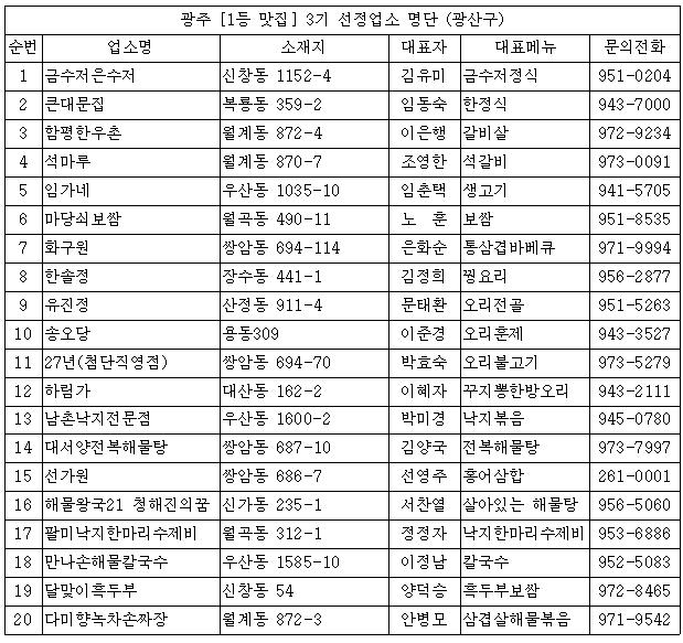 ±¤Áֽÿ¡ µû¸£¸é 'Á¦2±â ±¤ÁÖ 1µî ¸À Áý' °ü¸®±â°£ÀÌ Áö³ÇØ ¸» Á¾·áµÊ¿¡ µû¶ó ´ëÇ¥À½½ÄÀÇ ¸À°ú ÀüÅ뼺, ¼ºñ½º, ½Ã¼³ µîÀ» Æò°¡ÇØ 'Á¦3±â ±¤ÁÖ 1µî ¸À Áý' 100°³ ¾÷¼Ò¸¦ ¼±Á¤Çß´Ù.