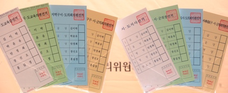 °¢ ÅõÇ¥¿ëÁö´Â À¯±ÇÀÚÀÇ È¥µ·À» ¹æÁöÇϱâ À§ÇØ ¹é»ö, ¿¬µÎ»ö, Çϴûö, °è¶õ»öÀÇ ¼øÀ¸·Î ¸ðµÎ ´Ù¸£°Ô ÇßÀ¸¸ç Å©±âµµ ±³À° °ü·Ã°ú ºñ·Ê´ëÇ¥ ÅõÇ¥´Â 7.5§¯·Î 9§¯ÀÎ Áö¿ª±¸ ÀÇ¿ø ¹× ±¤¿ª ÀÇ¿ø ÅõÇ¥¿ëÁö¿Í Â÷À̸¦ µ×´Ù.
