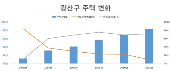 ´Ã¾î³ °Í¿¡ ºñÇØ ÁÙ¾îµç °Íµµ ÀÖ´Ù. ¹Ù·Î ÁÖÅúоߴÙ. 1990³â ±¤»ê±¸ ´Üµ¶ÁÖÅà ºñÀ²Àº Àüü ÁÖÅÃÀÇ 83.9%(2¸¸489È£)¿´´Ù. ÇÏÁö¸¸ 2015³â ´Üµ¶ÁÖÅÃÀº ÀüüÀÇ 9.4%(1¸¸5497È£)·Î ÁÙ¾ú´Ù. ÁÙ¾îµç ´Üµ¶ÁÖÅà ÀÚ¸®¿¡´Â ¾ÆÆÄÆ®°¡ µé¾î¼¹´Ù. ±¤»ê±¸¿¡¼ ¾ÆÆÄÆ®´Â 1990³â 9.8%(2394È£)¿¡¼ 2015³â 71.4%(11¸¸8020È£)·Î ÆøÁõÇß´Ù.