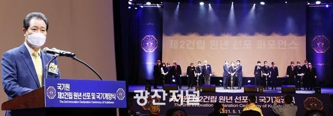 Á¤¼¼±Õ îñ ±¹¹«ÃѸ®µµ Ãà»ç¸¦ ÅëÇØ ¡°±¹±â¿ø Á¦2°Ç¸³ ¿ø³â ¼±Æ÷ ¹× ±¹±â °Ô¾ç½Ä °³ÃÖ¸¦ Áø½ÉÀ¸·Î ÃàÇϵ帰´Ù. ±¹±â űǵµ¿¡ ºñÇØ¼ ±¹±â¿øÀÌ ³°°í ½Ã¼³ÀÌ Çù¼ÒÇÏ´Ù°í »ý°¢ÇÑ´Ù. ¼ö¸®¶óµµ ÇÒ ¼ö Àִ ü°è°¡ ÀÖ¾úÀ¸¸é ÁÁ°Ú´Ù. ÈûÀ» º¸Å°ڴ١±¸é¼ ¡°³»³â¿¡´Â ±¹±â¿ø °³¿ø 50ÁÖ³âÀÌ µÈ´Ù. Àü°©±æ ÀÌ»çÀå°ú À̵¿¼· ¿øÀåÀÇ ¸®´õ½Ê¿¡ űǵµÀÇ ¿¬´ë¿Í Çù·ÂÀÌ ´õÇØÁø´Ù¸é 50Áֳ⿡´Â ºû³ª´Â °á½ÇÀÌ ³²°ÜÁö¸®¶ó »ý°¢ÇÑ´Ù. ¿ì¸® űǵµÀÎ ÇѺРÇѺÐÀÌ Å±ǵµÀÇ ¿ª»ç¸¦ ½á³»·Á °¥ ÁÖ¿ªÀ̶ó´Â ¸¶À½À¸·Î ÈûÀ» ¸ð¾Æ Áֱ⠹ٶõ´Ù¡±°í °Ý·ÁÇß´Ù.