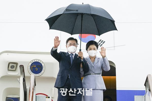 ¿µ±¹ G7Á¤»óȸÀÇ¿Í ¿À½ºÆ®¸®¾Æ, ½ºÆäÀÎ ±¹ºó ¹æ¹®À» ¸¶Ä£ ¹®ÀçÀÎ ´ëÅë·É°ú ±èÁ¤¼÷ ¿©»ç°¡ 18ÀÏ ¼­¿ï°øÇ׿¡ µµÂøÇØ ¼ÕÀ» Èçµé¸ç ÀλçÇϰí ÀÖ´Ù. /»çÁø Á¦°ø=û¿Í´ë
