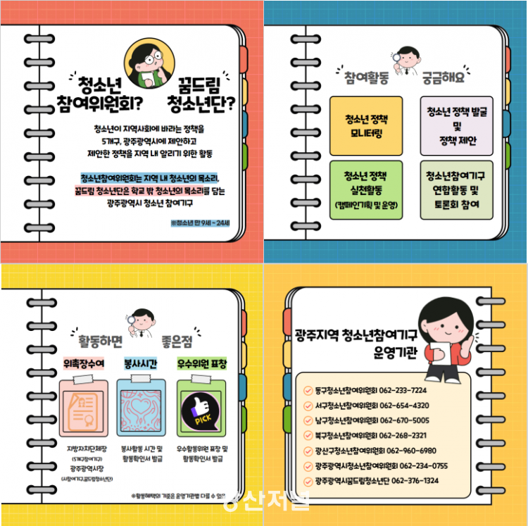 ±¤Áֽà û¼Ò³â Âü¿©±â±¸(µ¿¡¤¼¡¤³²¡¤ºÏ¡¤±¤»ê±¸ û¼Ò³âÂü¿©À§¿øÈ¸, ±¤ÁÖ±¤¿ª½Ãû¼Ò³âÂü¿©À§¿øÈ¸, ±¤ÁÖ±¤¿ª½Ã²Þµå¸²Ã»¼Ò³â´Ü)´Â û¼Ò³âÀÌ Á÷Á¢ Á¤Ã¥À» ¸ð´ÏÅ͸µ ¹× û¼Ò³âµé¿¡°Ô ÇÊ¿äÇÑ Á¤Ã¥Á¦¾È Ȱµ¿À» ¿î¿µÇϸç, Áö¿ª ³» û¼Ò³âÂü¿©±â±¸¿Í ¿¬ÇÕȰµ¿À» ÅëÇØ Á¤Ã¥À» °øÀ¯Çϰí Åä·Ðȸ ¹× Á¤Ã¥Á¦¾È Ä·ÆäÀΠȰµ¿À» ÁøÇàÇÑ´Ù.