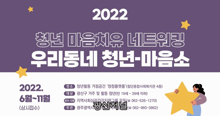 ¿ì¿ï°ú ºÒ¾È, Á¤¼Àû °í¸³ µîÀ¸·Î °í¹ÎÇÏ´Â ±¤»ê±¸ û³â(¸¸19~39¼¼)À» ´ë»óÀ¸·Î 11¿ù±îÁö ¸¶À½Áø´Ü ½É¸®°Ë»ç, Áý´Ü‧°³Àλó´ã, û³â ³×Æ®¿öÅ·À» À§ÇÑ ¸¶À½Ä¡À¯ ¿øµ¥ÀÌŬ·¡½º, ½É¸® ¼¼¹Ì³ª µîÀ» Á¦°øÇÑ´Ù. ½É¸®°Ë»ç´Â ¼º°Ý, ÇнÀ, Áø·Î µîÀ» °Ë»çÇϸç, 1Àδç ÃÖ´ë 2°Ç±îÁö °¡´ÉÇÏ´Ù. °Ë»ç ÈÄ¿¡´Â Àü¹®°¡ ÇØ¼®»ó´ãµµ ¹ÞÀ» ¼ö ÀÖ´Ù. °³Àλó´ãÀº û³âÀÌ ½É¸® Àü¹®°¡¿Í 1:1 »ó´ãÀ» ÅëÇØ ´ëÀΰü°è, ½ºÆ®·¹½º µî Àϻ󿡼 °Þ´Â ¾î·Á¿ò°ú °í¹ÎÀ» ³ª´ ¼ö ÀÖ´Ù.