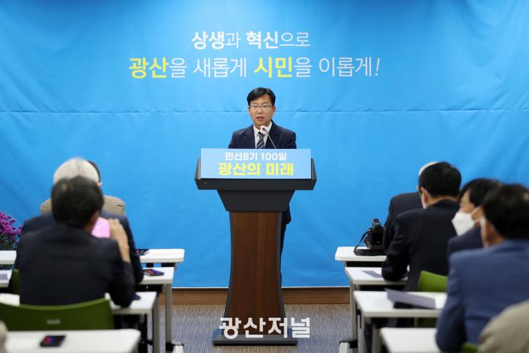 ¹Úº´±Ô ûÀåÀº »õ·Î¿î ±¤»êÀÇ ¼³°èµµ¸¦ ´ãÀº 40°³ °ø¾àÀ» Áß½ÉÀ¸·Î ¹Î¼±8±â ±¤»ê±¸°¡ ÃßÁøÇÒ ÁÖ¿ä »ç¾÷°ú ¹Ì·¡ ºñÀüÀ» ¼Ò°³Çß´Ù. ¿ì¼± ±¤ÁÖÇü ÀÏÀÚ¸® ½ÃÁð2¸¦ ±¤»ê¿¡¼ ½ÇÇöÇÏ°Ú´Ù°í ¹àÇû´Ù. ¹Úº´±Ô ûÀåÀº ¡°½ÃÁð1ÀÌ ±¤Áֱ۷ιú¸ðÅͽº¶ó´Â ÇϳªÀÇ ±â¾÷À» Ãâ¹ü½ÃŲ °ÍÀ̶ó¸é, ½ÃÁð2´Â ±¤ÁÖÇü ÀÏÀÚ¸®°¡ ±¤»êÀÇ ¸¹Àº ±â¾÷¿¡ ³»¸®µµ·Ï ÇÏ´Â Á¤Ã¥¡±À̶ó¸ç ¡°³ë»ç ÇÕÀÇ¿Í ½Ã¹Î»çȸÀÇ ÁöÁö¸¦ ¹è°æ »ï¾Æ ¡®Áö¼Ó°¡´É¼ºÀå °æÁ¦Æ¯±¸¡¯¸¦ À̲ø¾î³»°Ú´Ù¡±°í ¼³¸íÇß´Ù.
