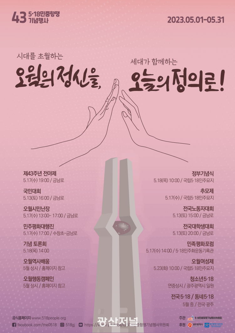 62°³ Âü°¡´Üü·Î ±¸¼ºµÈ ¡®Á¦43ÁÖ³â 5¡¤18¹ÎÁßÇ×Àï±â³äÇà»çÀ§¿øÈ¸¡¯(ÀÌÇÏ Çà»çÀ§)´Â Áö³ 3¿ù ½Ã¹Î °ø¸ð¸¦ ÅëÇØ ¡®¿À¿ùÀÇ Á¤½ÅÀ», ¿À´ÃÀÇ Á¤ÀÇ·Î!¡¯¸¦ ¿ÃÇØ ±â³äÇà»ç °ø½Ä±¸È£(½½·Î°Ç)·Î ¼±Á¤Çß´Ù.
