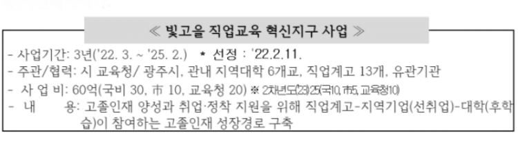 Áö³ÇØ ±³À°ºÎ °ø¸ð»ç¾÷À¸·Î ¼±Á¤µÈ ¡®ºû°íÀ» Á÷¾÷±³À° Çõ½ÅÁö±¸ »ç¾÷¡¯Àº Áö¿ª Àα¸°¨¼Ò ¹× °í·ÉȰ¡ °¡¼ÓÈÇÏ´Â »óȲ¿¡¼ û³âÀα¸ÀÇ Áö¿ª Á¤ÂøÀ» ³ôÀ̱â À§ÇØ ±¤ÁÖ½Ã¿Í ½Ã±³À°Ã»ÀÌ Á÷¾÷°è°í¡¤´ëÇС¤Áö¿ª±â¾÷°ú Çù·ÂÇØ ÃßÁøÁßÀÎ »õ·Î¿î Á÷¾÷±³À° Áö¿øÃ¼°èÀÌ´Ù.