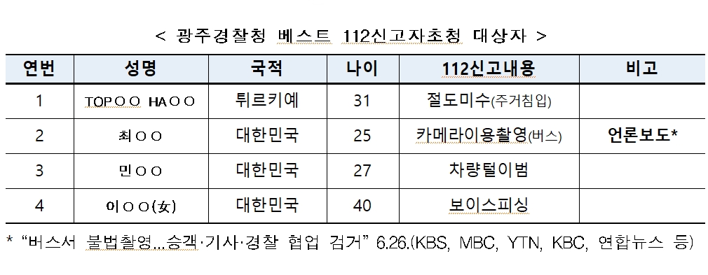 À̹ø ÃÊû ´ë»óÀÚ´Â ¹üÁËÇàÀ§ ½Ãµµ¸¦ ¸ñ°ÝÇÑ ÈÄ Àû±ØÀûÀÎ 112½Å°í¸¦ ÅëÇØ ¹üÀΰ˰ſ¡ ±â¿©ÇÑ ÃÑ 4¸íÀÇ ½Ã¹ÎÀ¸·Î ƯÈ÷ Áö³´Þ ¸» ¾ð·Ðº¸µµ*µÈ ¹ö½º¿¡¼ ºÒ¹ýÃÔ¿µ¹ü °Ë°Å¿¡ ±â¿©ÇÑ ½Å°íÀÚµµ Æ÷ÇԵǾú´Ù.