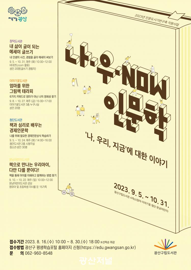 °¢ ±¸¸³µµ¼°ü Àι®°Á Âü¿© ½ÅûÀº 16ÀϺÎÅÍ ÀÌ´Þ ¸»±îÁö ±¤»ê Æò»ýÇнÀÆ÷ÅÐ(edu.gwangsan.go.kr)¿¡¼ ÇÒ ¼ö ÀÖ´Ù.