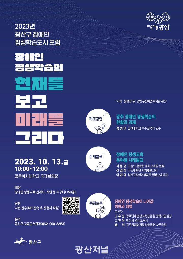 Æ÷·³Àº Á¶¼±´ëÇб³ Ư¼ö±³À°°ú ±èÁ¤¿¬ ±³¼öÀÇ ¡®±¤ÁÖ Àå¾ÖÀÎ Æò»ýÇнÀ ÇöȲ°ú °úÁ¦¡¯ ±âÁ¶ °¿¬À» ½ÃÀÛÀ¸·Î Àå¾ÖÀÎ Æò»ý±³À° »ç·Ê ÁÖÁ¦ ¹ßÇ¥¿Í ±¤»ê±¸ Àå¾ÖÀÎ Æò»ýÇнÀÀÌ ³ª¾Æ°¥ ¹æÇâ°ú ÇØ¹ý ¸ð»öÀ» À§ÇÑ Àü¹®°¡µéÀÇ Á¾ÇÕÅä·Ð, ÁúÀÇÀÀ´ä ¼øÀ¸·Î ÁøÇàµÈ´Ù.