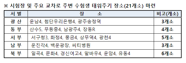 ±¤ÁÖ°æÂûû °ü°èÀÚ´Â µè±âÆò°¡ ½Ã°£´ë ¼ÒÀ½ ¿¹¹æÀ» À§ÇØ 3±³½Ã(13:10¡13:35, 25ºÐ°£)¿¡´Â ½ÃÇèÀå ÁÖº¯À» Åë°úÇÏ´Â Â÷·®Àº °æÀû»ç¿ë ÀÚÁ¦¿Í ÇÔ²² ½ÃÇè ´çÀÏ ¿ÀÀü ´ëÁß±³ÅëÀ» ÀÌ¿ëÇÏ¿© ¼öÇè»ýµéÀÇ ½ÃÇèÀå ÀԽǿ¡ Â÷ÁúÀÌ ¾øµµ·Ï ÇùÁ¶ÇØ ÁÙ °ÍÀ» ½Ã¹Îµé¿¡°Ô ´çºÎÇÏ¿´´Ù.