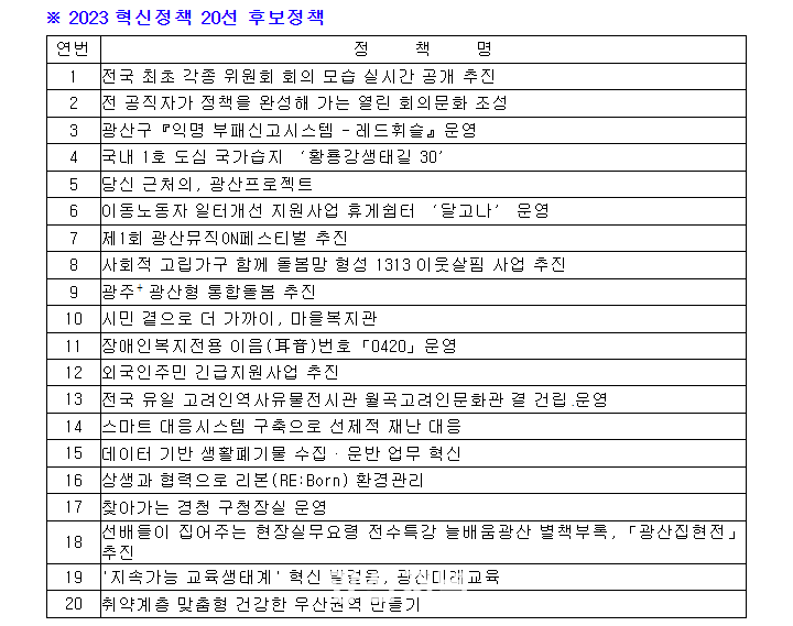 ±¤»ê±¸´Â Áö³´ÞºÎÅÍ º»Ã» 45°³ ºÎ¼·ÎºÎÅÍ ¿ÃÇØ ÃßÁøÇÑ 70°ÇÀÇ Á¤Ã¥ »ç·Ê¸¦ Á¢¼ö, »çÀü ÀûÁ¤¼º °ËÅä, Àü¹®°¡¿Í ³»ºÎ Æò°¡´ÜÀÇ 1Â÷ Æò°¡¸¦ ÅëÇØ 20°ÇÀÇ Èĺ¸ Á¤Ã¥À» È®Á¤Çß´Ù.