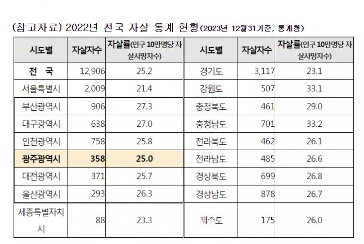 ±¤ÁÖ±¤¿ª½Ã(½ÃÀå °±âÁ¤)¿¡ µû¸£¸é ÃÖ±Ù Åë°èûÀÌ ¹ßÇ¥ÇÑ ¡®2022³â »ç¸Á¿øÀÎ Åë°è¡¯¸¦ º¸¸é ±¤Áֽà ÀÚ»ì·üÀº 2021³â 26.4¸í¿¡¼ 2022³â 25¸íÀ¸·Î 1.4¸í(5.3%) ÁÙ¾îµç °ÍÀ¸·Î Áý°èµÆ´Ù. (¡Ø ÀÚ»ì·ü : Àα¸ 10¸¸¸í´ç ÀÚ»ìÀÚ¼ö)