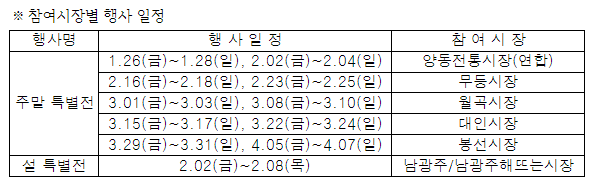 ±¤Áֽô ¶Ç ¼³ ¸íÀýÀ» ¸Â¾Æ ÀüÅë½ÃÀå ÀÌ¿ë ÆíÀǸ¦ À§ÇØ ¿À´Â 2¿ù 3ÀϺÎÅÍ 12ÀϱîÁö ³²±¤ÁÖ½ÃÀå µî 8°³ ÀüÅë½ÃÀå ÁÖº¯µµ·ÎÀÇ ÁÖÂ÷¸¦ Çã¿ëÇÑ´Ù.