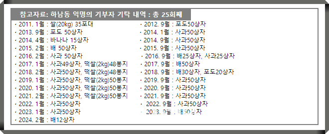 ¹°°¡ »ó½Â°ú ¾î·Á¿î °æÁ¦ »óȲ¿¡µµ ÀØÁö ¾Ê°í ã¾Æ¿Â Çϳ²µ¿ ±âºÎ õ»ç. ±×ÀÇ µû¶æÇÑ ¸íÀý ³ª´®Àº À̹øÀÌ 25¹øÂ°´Ù. 2011³â ¼³À» ½ÃÀÛÀ¸·Î ¸Å³â ¸íÀý¸¶´Ù ¾ó±¼, À̸§À» ¼û±ä ä ¾î·Á¿î ÀÌ¿ôÀ» À§ÇÑ °úÀÏ, ½Ò, ¶± µîÀ» ÈÄ¿øÇϰí ÀÖ´Ù.