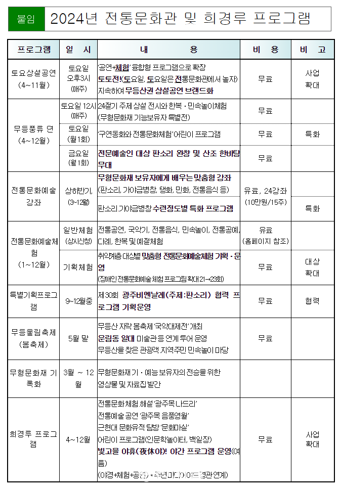 ±¤ÁÖ±¤¿ª½Ã(½ÃÀå °±âÁ¤)´Â ¹«ÇüÀ¯»ê Àü½Â°ø°£ÀÌÀÚ ÀüÅ빮ȿ¹¼úÀÇ »ê½ÇÀÎ ¡®ÀüÅ빮Ȱü¡¯°ú µµ½É ¼Ó ÀüÅë ´©°¢ÀÎ ¡®Èñ°æ·ç(ýìÌÔ×§)¡¯ÀÇ 2024³â ¿î¿µ°èȹÀ» È®Á¤Çß´Ù.