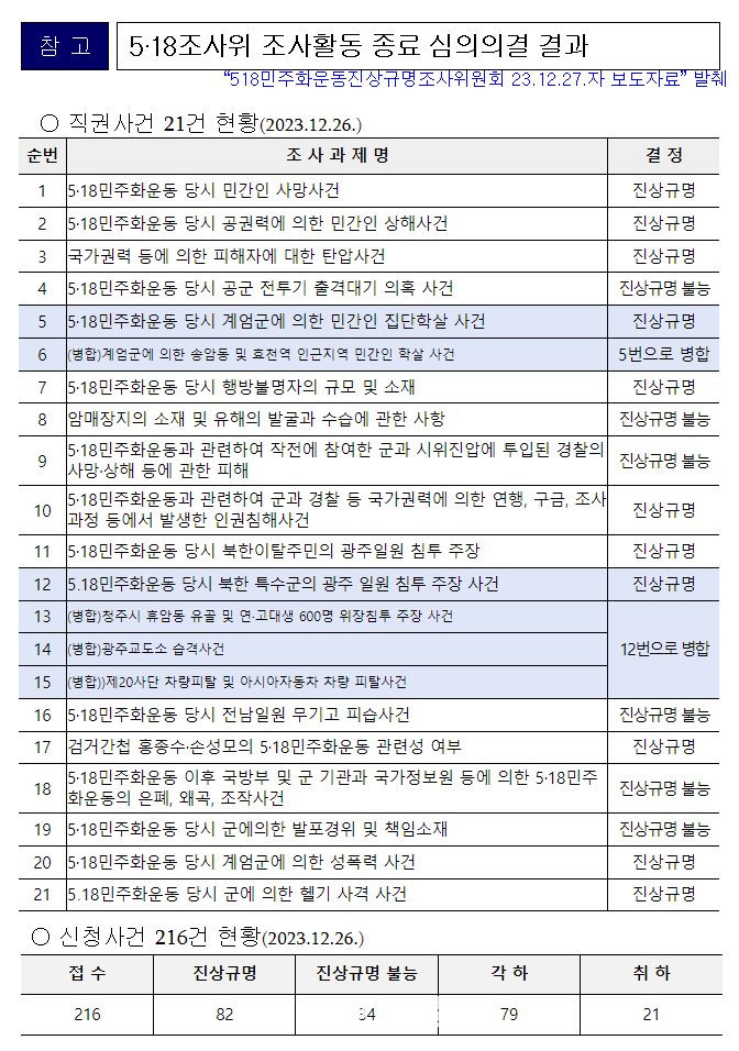 ÇÑÆí 5¡¤18¹ÎÁÖȿÁø»ó±Ô¸íÁ¶»çÀ§¿øÈ¸´Â 5¡¤18Áø»ó±Ô¸í¹ý¿¡ ÀǰŠ5¡¤18¹ÎÁÖȿ Áø»ó±Ô¸í ¾÷¹«¸¦ ¼öÇàÇϱâ À§ÇØ 2019³â 12¿ù Ãâ¹üÇß´Ù. Á¶»çÀ§´Â 4³â °£ Á¶»çȰµ¿À» ÅëÇØ Á÷±Ç Á¶»ç»ç°ÇÀÎ 21°Ç Áß 15°Ç Áø»ó±Ô¸í °áÁ¤, 6°ÇÀ» Áø»ó±Ô¸í ºÒ´É °áÁ¤ÇßÀ¸¸ç, ½Åû»ç°Ç Áß °¢ÇÏ¡¤ÃëÇϸ¦ Á¦¿ÜÇÑ 116°Ç¿¡ ´ëÇØ Áø»óÁ¶»ç¸¦ ÁøÇàÇØ 82°Ç Áø»ó±Ô¸í °áÁ¤, 34°ÇÀ» Áø»ó±Ô¸í ºÒ´É °áÁ¤Çß´Ù.