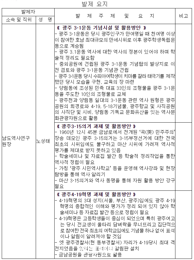 À̹ø Åä·Ðȸ´Â ±¤ÁÖ3¡¤1¿îµ¿, ±¤ÁÖ3¡¤15ÀǰÅ, ±¤ÁÖ4‧19Çõ¸í ¿ª»ç¸¦ Áß½ÉÀ¸·Î Àι°°ú ÇöÀå µî ÀÚ¿ø ¹ß±¼°ú Ȱ¿ë¹æ¾ÈÀ» ¸ð»öÇϱâ À§ÇØ ¸¶·ÃµÆ´Ù. À̳¯ Åä·Ðȸ¿¡¼´Â »ç°Çº° ¹ÎÁÖ¿ª»ç ÀÚ¿øÀ» ¹ß±¼Çϰí Á¤Ã¥ Ȱ¿ë °èȹÀ» ¼ö¸³ÇÏ´Â µî ½ÉµµÀÖ´Â ³íÀǸ¦ ÁøÇàÇÒ ¿¹Á¤ÀÌ´Ù.