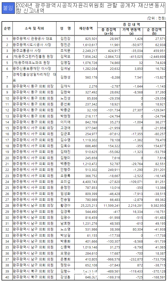 [±¤»êÀú³Î] ±¤ÁÖ±¤¿ª½Ã°øÁ÷ÀÚÀ±¸®À§¿øÈ¸´Â Àç»ê°ø°³ ´ë»óÀÚ 77¸í¿¡ ´ëÇÑ ¡®2024³âµµ Á¤±â ¹× ¼ö½Ã Àç»êº¯µ¿ ½Å°í³»¿ª¡¯À» 28ÀÏ ÀüÀÚ°øº¸¿¡ °ø°³Çß´Ù.