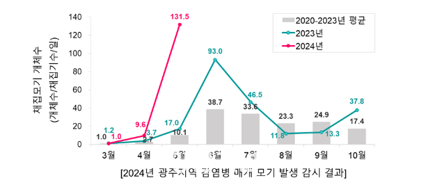 º¸°Çȯ°æ¿¬±¸¿øÀº ±âÈÄȯ°æº¯È¿¡ µû¸¥ °¨¿°º´ ¸Å°³ ¸ð±â ¹ß»ý °¨½Ã¸¦ ¸Å³â 3¿ùºÎÅÍ 11¿ù±îÁö ¿ù 2ȸ ¼öÇàÇϰí ÀÖ´Ù. µµ½É ½£°ú °ø¿ø, ¼öº¯ Áö¿ª¿¡ ¸ð±â¸¦ À¯ÀÎÇϴ äÁý±â¸¦ ¼³Ä¡Çϰí, äÁýµÈ ¸ð±âÀÇ °³Ã¼¼ö¿Í Á¾(ðú)À» Á¶»çÇÑ µÚ, ¸ð±â°¡ ¸Å°³ÇÏ´Â °¨¿°º´ º´¿øÃ¼°¡ ÀÖ´ÂÁö °Ë»ç¸¦ ÁøÇàÇÑ´Ù. ¶Ç °¨½Ã °á°ú´Â °¨¿°º´ ¿¹¹æ°ü¸®¸¦ À§ÇØ ÀÚÄ¡±¸ µî °ü°è±â°ü°ú °øÀ¯ÇÑ´Ù.