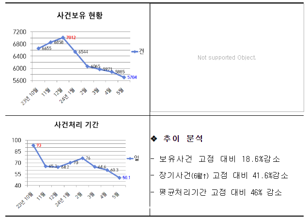¶ÇÇÑ, ÀÛ³â 11¿ù °³Á¤ ¼ö»ç ÁØÄ¢¿¡ µû¶ó °í¼Ò¡¤°í¹ß Àü°Ç Á¢¼ö Á¦µµ°¡ ½ÃÇàµÇ¸é¼ °°Àº ÇØ 12¿ù »ç»ó ÃÖ´ëÀÇ º¸À¯ °Ç¼ö(7,012°Ç)¸¦ ±â·ÏÇϱ⵵ ÇßÀ¸³ª, ¿ÃÇØ 1¿ù 6,544°Ç, 2¿ù 6,065°Ç, 3¿ù 5,971°Ç, 4¿ù 5,885°ÇÀ¸·Î Áö¼Ó °¨¼ÒÇÏ¿© 5¿ù ¸» ±âÁØ 5,704°ÇÀ» ±â·ÏÇϸç À۳⠰íÁ¡ ´ëºñ 18.6% °¨¼ÒÇÏ¿´´Ù. ÀÌ·¯ÇÑ ¼º°úÀÇ ¿øÀÎÀ¸·Î´Â ü°èÀûÀÎ »ç°Ç °ü¸®¸¦ À§ÇØ ±×°£ ÇöÀå ¼ö»ç ÀÎ·Â Ãæ¿ø, °æÂû¼ ¼ö»çÆÀ(°æÁ¦¡¤»çÀ̹ö) ÅëÇÕ, ½ÃµµÃ» Àü¹® ¼ö»çüÁ¦ ½ÃÇà µî Á¶Á÷ ü°è¸¦ °³¼±Çϰí, Àå±â»ç°Ç ÁýÁß°ü¸® T/F ¿î¿µÀ» ÅëÇÑ Ã¼°èÀûÀ¸·Î »ç°Ç °ü¸®¸¦ °ÈÇѵ¥ ±âÀÎÇÑ °ÍÀ¸·Î ºÐ¼®Çß´Ù.