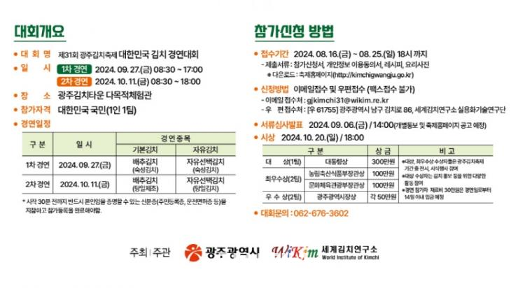 ´ë»ó 1¸í¿¡°Ô´Â ´ëÅë·É»ó ½Ã»ó°ú »ó±Ý 300¸¸ ¿øÀ», ÃÖ¿ì¼ö»ó 2¸í¿¡°Ô´Â ³ó¸²Ãà»ê½ÄǰºÎ‧¹®ÈüÀ°°ü±¤ºÎ Àå°ü»ó°ú »ó±Ý °¢ 100¸¸ ¿øÀ», ¿ì¼ö»ó 2¸í¿¡°Ô´Â ±¤ÁÖ±¤¿ª½ÃÀå»ó°ú »ó±Ý °¢ 50¸¸ ¿øÀ» ¼ö¿©ÇÑ´Ù. ¼ö»ó ÀÛǰÀº ±¤ÁÖ±èÄ¡ÃàÁ¦(10¿ù18ÀÏ~10¿ù20ÀÏ) ±â°£ Àü½ÃÇØ ¹æ¹®°´µé¿¡°Ô ¼ö»óÀÛÀÇ µ¶Ã¢¼º°ú ¿ì¼ö¼ºÀ» ³Î¸® ¾Ë¸± °èȹÀÌ´Ù. Âü°¡ ½ÅûÀº Á¦31ȸ ±¤ÁÖ±èÄ¡ÃàÁ¦ ´©¸®Áý(http://kimchi.gwangju.go.kr) À̳ª ¼¼°è±èÄ¡¿¬±¸¼Ò ´©¸®Áý(www.wikim.re.kr)¿¡¼ ½Åû¼ ¾ç½ÄÀ» ³»·Á¹Þ¾Æ À̸ÞÀÏ ¶Ç´Â ¿ìÆíÀ» ÅëÇØ Á¦ÃâÇÏ¸é µÈ´Ù.