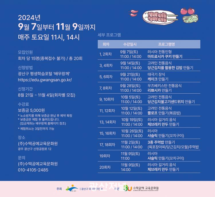 ÃÑ 20Â÷½Ã·Î, ȸÂ÷´ç 15¸íÀ» ¼±Âø¼ø ¸ðÁýÇÑ´Ù. Âü¿© ½ÅûÀº 21ÀϺÎÅÍ ¹è¿ì¶û²² ´©¸®Áý(https://edu.gwangsan.go.kr)¿¡¼ ÇÒ ¼ö ÀÖ´Ù. ½Åû ½Ã ¿ä¸® Àç·á ³¶ºñ¿Í ¹«´Ü ºÒÂüÀ» ¹æÁöÇϱâ À§ÇÑ º¸Áõ±Ý 5,000¿øÀ» ¿Ï³³ÇØ¾ß ¿¹¾àÀÌ È®Á¤µÈ´Ù. º¸Áõ±ÝÀº üÇè ÈÄ ¼ö°»ý¿¡°Ô ¹ÝȯÇÑ´Ù.