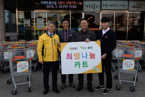 À̸¶Æ® ±¤»êÁ¡(ÁöÁ¡Àå ¼º´Áø)ÀÌ 30ÀÏ ¡®»ç¶ûÀÇ Èñ¸ÁīƮ¡¯ 200¿© °³¸¦ Åõ°Ô´õ±¤»ê ³ª´®¹®ÈÀç´Ü¿¡ ±âÁõÇß´Ù. À̸¶Æ® ±¤»êÁöÁ¡ÀÌ Ä«Æ®¸¦ ½ÅÇüÀ¸·Î ±³Ã¼ÇÏ¸é¼ ±âÁ¸ÀÇ °Í Áß »ç¿ë °¡´ÉÇÑ Ä«Æ®¸¦ Àç´Ü¿¡ Àü´ÞÇÑ °Í. ±âÁõ¹ÞÀº īƮ´Â ³óÃÌÁö¡¦ |