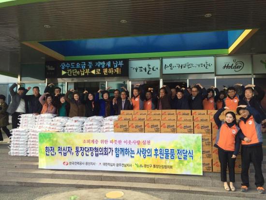 Çѱ¹Àü·Â°ø»ç ±¤»êÁö»ç¿Í ´ëÇÑÀû½ÊÀÚ»ç ±¤ÁÖ¡¤Àü³²Áö»ç´Â 9ÀÏ ±¤»ê±¸ ÅëÀå´ÜÀåÇùÀÇȸ¿¡ ¾î·Á¿î ÀÌ¿ôÀ» µµ¿Í´Þ¶ó¸ç ½Ò 130Æ÷´ë(10kgµéÀÌ)¿Í ¶ó¸é 100»óÀÚ¸¦ Àü´ÞÇß´Ù.