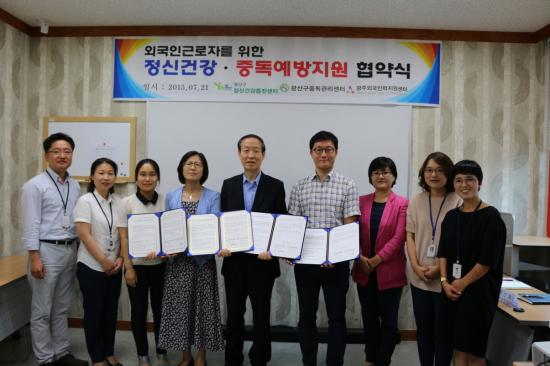 ±¤Áֿܱ¹ÀηÂÁö¿ø¼¾ÅÍ(¼¾ÅÍÀå À̰èÁ¤)´Â 7¿ù 21ÀÏ ±¤»ê±¸ Á¤½Å°Ç°ÁõÁø¼¾ÅÍ(¼¾ÅÍÀå À±Àμ±) ¹× ±¤ÁÖ±¤»ê±¸Áßµ¶°ü¸®¼¾ÅÍ(¼¾ÅÍÀå ¹Ú¼ö¾Æ) ¿Í ¿Ü±¹ÀαٷÎÀÚÀÇ Á¤½Å°Ç°Áö¿ø°ú Áßµ¶¿¹¹æÁö¿øÀ» À§ÇÑ ¾÷¹«Çù¾à(MOU)À» ü°áÇß´Ù°í ¹àÇû´Ù.