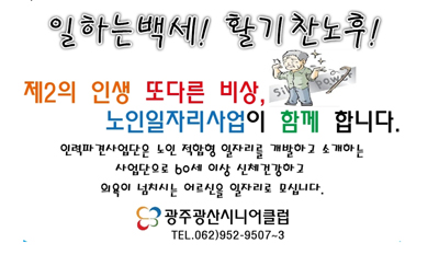 ±¤»ê½Ã´Ï¾îŬ·´Àº ³ëÀÎÀÏÀÚ¸® »ç¾÷ Àü´ã±â°üÀ¸·Î 60¼¼ ÀÌ»ó °Ç°ÇÑ ¾î¸£½ÅµéÀÇ »çȸÀû °æÇè°ú »îÀÇ ÁöÇý¸¦ Ȱ¿ëÇÑ ÀÏÀÚ¸®¸¦ °³¹ßÇÏ°í º¸±ÞÇϴµ¥ ÃÖ¼±À» ´ÙÇϰí ÀÖ´Ù.