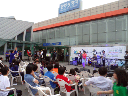 ±¤»ê±¸°¡ ¡®±¤ÁÖ Ã¶µµ°³Åë 100³â¡¯ ¸ÂÀÌ ±â³ä»ç¾÷ÀÇ Çϳª·Î Áö³´Þ 31ÀÏ ±¤ÁÖ¼ÛÁ¤¿ª ¾Õ ±¤Àå¿¡¼ ¸±·¹ÀÌ ÄܼƮ¸¦ °³ÃÖÇß´Ù.