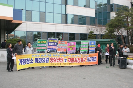 ±¤»ê±¸ »ýȰ¾²·¹±â ¼ö°Å ¾÷¹« Á¾»çÀÚµéÀÌ ±âÀÚȸ°ßÀ» °®°í ³ëµ¿ÀÚ Åº¾Ð Áߴܰú µ¿ÀÏ ³ëµ¿, µ¿ÀÏ ÀÓ±Ý º¸Àå ±×¸®°í Åë»óÀÓ±Ý Áö±ÞÀ» Ã˱¸Çß´Ù.