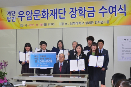 (Àç)¿ì¾Ï ¹®ÈÀç´Ü(¼³¸³ÀÚ, Á¶¿ë±â ¹Ú»ç)Àº 2011Çг⵵ ÀåÇÐ±Ý Àü´Þ ¹× ÀåÇÐÁõ¼ ¼ö¿©½ÄÀ» ³²ºÎ´ëÇб³ ÄÄÆÛ·±½º ·ë¿¡¼ °¡Á³´Ù.