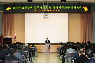 ±¤»ê±¸´Â Áö³ 21ÀÏ ±¸Ã» ´ëȸÀǽǿ¡¼ °øµ¿ÁÖÅà ÀÔÁÖÀÚ´ëÇ¥¿Í °ü¸®»ç¹«¼ÒÀå 240¿©¸íÀÌ Âü¿©ÇÑ °¡¿îµ¥ ¹ÎÇü¹è ±¸Ã»Àå°ú ¹ÚÇʼø ±¤ÁÖÀü³²³ì»ö¿¬Çջ繫óÀå, °øµ¿ÁÖÅÃÆÀÀåÀÌ °øµ¿ÁÖÅà °ü¸®․¿î¿µ¿¡ ´ëÇÑ ±³À°À» ½Ç½ÃÇß´Ù.