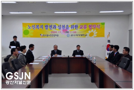 ±¤ÁÖ¿©ÀÚ´ëÇб³(ÃÑÀå ¿ÀÀå¿ø)¿Í ºû°íÀ»³ëÀΰǰŸ¿î(¿øÀå ³ª¹«¼®)Àº Áö³ 10ÀÏ ºû°íÀ»³ëÀκ¹ÁöÀç´Ü ȸÀǽǿ¡¼ »óÈ£ Çù·ÂÀ» À§ÇÑ ±³·ù Çù¾à½ÄÀ» °®°í, Áö¿ª»çȸ ³ëÀεéÀÇ º¹Áö¿Í °Ç° Çâ»ó ¹× ½Çõ ¹æ¾ÈÀ» Çù·ÂÇØ ³ª°¡±â·Î Çß´Ù.