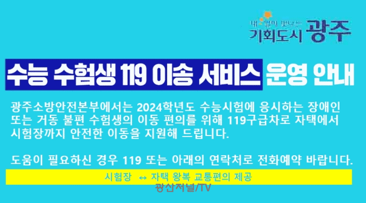 [±¤»êÀú³Î] ±¤ÁÖ±¤¿ª½Ã¼Ò¹æ¾ÈÀüº»ºÎ´Â ¿À´Â 16ÀÏ ½Ç½ÃÇÏ´Â 2024Çг⵵ ´ëÇмöÇдɷ½ÃÇè ¼öÇè»ý ÆíÀǸ¦ Áö¿øÇϱâ À§ÇØ ¡®119ÀÌ¼Û ¼ºñ½º¡¯¸¦ Á¦°øÇÑ´Ù.