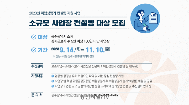 [±¤»êÀú³Î] ±¤ÁÖ±¤¿ª½Ã(½ÃÀå °±âÁ¤)´Â »êÀ翹¹æÀ» À§ÇÑ À§Ç輺Æò°¡ ÄÁ¼³ÆÃÀ» ¹ÞÀ» ¼Ò±Ô¸ð »ç¾÷Àå 50°÷À» ¸ðÁýÇÑ´Ù.