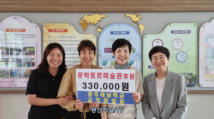 [±¤»êÀú³Î] ±¤ÁÖ°í·ÁÀθ¶À» »êÇÏ »õ³¯Çб³ ±³Á÷¿øµéÀÌ ¸¶À»¿¡ Á¤Âø, ÈÄÁøÀ» ¾ç¼ºÇϰڴٴ ²ÞÀ» ¹àÈù ¼¼°èÀûÀÎ °í·ÁÀÎȰ¡ ¹®ºòÅ丣(72¼¼) ȹéÀÇ ¹Ì¼ú°ü °Ç¸³ ±â±Ý 33¸¸¿øÀ» Àü´ÞÇß´Ù°í 23ÀÏ ¹àÇû´Ù.