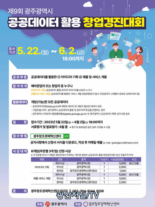 [±¤»êÀú³Î] ±¤ÁÖ±¤¿ª½Ã(½ÃÀå °±âÁ¤)´Â (Àç)±¤ÁÖâÁ¶°æÁ¦¼¾ÅÍ¿Í °øµ¿À¸·Î ¡®Á¦9ȸ ±¤ÁÖ±¤¿ª½Ã °ø°øµ¥ÀÌÅÍ È°¿ë â¾÷°æÁø´ëȸ¡¯¸¦ °³ÃÖÇϰí, Âü°¡ÀÚ ½ÅûÀ» 22ÀϺÎÅÍ 6¿ù 2ÀϱîÁö ¹Þ´Â´Ù.