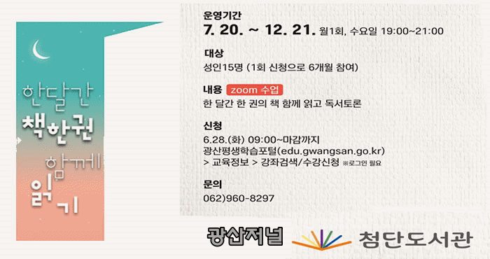 [±¤»êÀú³Î] ±¤ÁÖ ±¤»ê±¸ ÷´Üµµ¼°üÀÌ ÇÔ²² Àаí Åä·ÐÇÏ¸ç °øµ¿Ã¼ ÀǽÄÀ» °¡²Ù±â À§ÇÑ µ¶¼Åä·Ð ÇÁ·Î±×·¥ ¡®ÇÑ ´Þ°£ Ã¥ ÇÑ ±Ç ÇÔ²² Àб⡯ÀÇ ÇϹݱâ Âü¿©ÀÚ¸¦ ¸ðÁýÇÑ´Ù. À̹ø ÇÁ·Î±×·¥Àº 7¿ù20ÀϺÎÅÍ 12¿ù21ÀϱîÁö ¸Å¿ù 1ȸ ¼ö¿äÀÏ Àú³á,¡¦ |