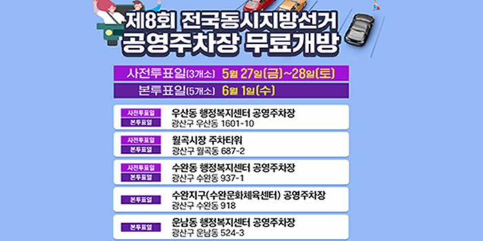 [±¤»êÀú³Î] ±¤ÁÖ±¤¿ª½Ã±¤»ê±¸½Ã¼³°ü¸®°ø´Ü(ÀÌ»çÀå ½Å¼±È£, ÀÌÇÏ ¡®°ø´Ü¡¯)Àº Á¦8ȸ Àü±¹µ¿½ÃÁö¹æ¼±°Å »çÀü ÅõÇ¥ ±â°£ÀÎ 5¿ù 27ÀÏ, 28ÀÏ °ø¿µÁÖÂ÷Àå 3°÷(202¸é)°ú º» ÅõÇ¥ÀÏÀÎ 6¿ù 1ÀÏ °ø¿µÁÖÂ÷Àå 5°÷(327¸é)À» ¹«·á °³¹æÇÑ´Ù. ´ë»ó ÁÖÂ÷À塦 |