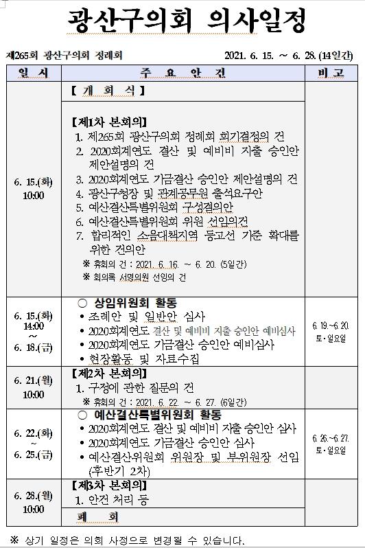 [ž´º½º] ±¤»ê±¸ÀÇȸ, 15ÀϺÎÅÍ Á¦265ȸ Á¤·Êȸ °³È¸ |2021. 06.14