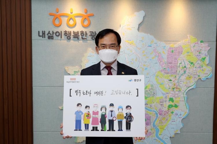[±¤»êÀú³Î] ±è»ïÈ£ ±¤»ê±¸Ã»ÀåÀÌ Äڷγª 19 »óȲ ¼Ó ´ë¸é ¾÷¹«¸¦ À̾´Â Çʼö³ëµ¿ÀÚµéÀ» ÀÀ¿øÇÏ´Â ¡®°í¸¿½À´Ï´Ù. Çʼö³ëµ¿ÀÚ¡¯ Ä·ÆäÀο¡ Âü¿©Çß´Ù.