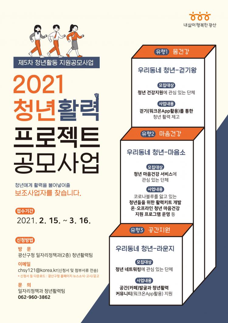 [±¤»êÀú³Î] ±¤»ê±¸(±¸Ã»Àå ±è»ïÈ£)°¡, Ȱ·Â ³ÑÄ¡°í ÇູÇÑ »îÀÇ ÁÖü·Î û³âÀÌ °Åµì³¯ ¼ö ÀÖµµ·Ï Áö¿øÇÏ´Â, ¡®2021 û³â Ȱ·Â ÇÁ·ÎÁ§Æ® °ø¸ð»ç¾÷¡¯ Âü¿© û³â´Üü¸¦ ´ÙÀ½ ´Þ 16ÀϱîÁö ¸ðÁýÇÑ´Ù.