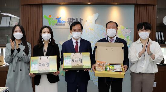 ±¤»ê±¸(±¸Ã»Àå ±è»ïÈ£)°¡ 6ÀÏ ±¸Ã»¿¡¼ ¡®¿ì¸® ³ó»ê¹° °áÈ¥½Ä ´ä·Êǰ Àü´Þ½Ä¡¯À» ¿°í, °áÈ¥ ´ä·ÊǰÀ¸·Î Áö¿ª ³ó»ê¹° ²Ù·¯¹Ì¸¦ ¼±ÅÃÇÑ °ø¹«¿ø 3¸í¿¡°Ô °¨»çÀÇ Àλ縦 ÀüÇß´Ù.