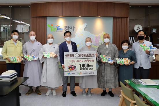 28ÀÏ ±¤ÁÖ½ÃÀÇ »çÂû ¼Ò¿øÁ¤»ç¿Í ±¤ÁÖºÒ±³¿¬ÇÕȸ°¡ Äڷγª 19¿Í ¼öÇØ ±Øº¹ ÇöÀå¿¡¼ ÀÏÇÏ´Â °ø¹«¿øµéÀ» À§·ÎÇϱâ À§ÇØ 1,400¿©¸íÀÌ ¸ÔÀ» ¼ö ÀÖ´Â 250¸¸ ¿ø »ó´çÀÇ ¡®Èû³»¶ó °Ý·Á ¶±¡¯À» ±¤»ê±¸¿¡ Àü´ÞÇß´Ù.