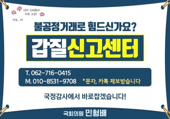 ¹ÎÇü¹è ÀÇ¿ø(±¤ÁÖ ±¤»ê±¸À»)Àº ¡°°¢Á¾ ºÒ°øÁ¤°Å·¡ ±ÙÀýÀ» À§ÇÑ ¡®°©Áú ½Å°í¼¾ÅÍ¡¯¸¦ ¿î¿µÇÑ´Ù¡±°í 31ÀÏ ¹àÇû´Ù. ¼¾ÅÍ´Â ´õºÒ¾î¹ÎÁÖ´ç ±¤»ê±¸À» Áö¿ªÀ§¿øÈ¸ »ç¹«¼Ò¿¡ ¼³Ä¡µÆ´Ù.