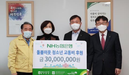 NH³óÇùÀºÇà ±¤ÁÖº»ºÎ(º»ºÎÀå ÃÖ¿µ)´Â 12ÀÏ ±¤Áֽñ³À°Ã»(±³À°°¨ ÀåÈÖ±¹)À» ¹æ¹®ÇØ µ¹º½ ÀÌ¿ô û¼Ò³âµéÀ» À§ÇÑ ±³Åëºñ 3õ¸¸ ¿øÀ» Àü´ÞÇß´Ù.