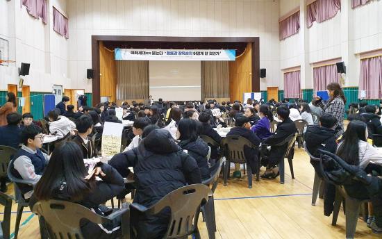 ¼±¿îÁßÇб³(±³Àå À±Çö¼÷)°¡ Áö³´Þ 27ÀÏ 1Çгâ Àüü Çлý 400¸íÀÌ Âü¼®ÇÑ °¡¿îµ¥ 2Ãþ ¼±¿î°ü(°´ç)¿¡¼ ¡®È²·æ° Àå·Ï½ÀÁö ¾î¶»°Ô ÇÒ °ÍÀΰ¡?¡¯¸¦ ÁÖÁ¦·Î Åä·Ðȸ¸¦ °³ÃÖÇß´Ù.