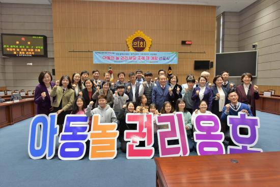 ±¤»ê±¸ÀÇȸ(ÀÇÀå ¹èÈ«¼®)°¡ 20ÀÏ ±¤ÁÖ½ÃÀÇȸ º»È¸ÀÇÀå¿¡¼ ¿¸° ¾Æµ¿ÀÇ ³î ±Ç¸® º¸Àå Á¶·Ê ¼±Æ÷½Ä¿¡ Âü¼®ÇØ ±¤¿ª½Ã ÃÖÃÊ·Î ±¤ÁÖ½Ã, ½Ã ±³À°Ã», ÀÚÄ¡±¸¿¡¼ ÇÔ²² ¹ßÀÇÇÑ ¡®¾Æµ¿ÀÇ ³î ±Ç¸® º¸Àå Á¶·Ê¡¯ ¼±Æ÷¸¦ ÇÔ²² Çß´Ù.